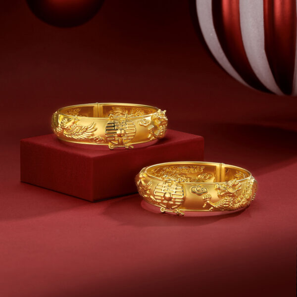 龍鳳鐲寓意「龍鳳呈祥」 “無鐲不成婚,一世一雙人” “手鐲”諧音“守著” 寓意守護著家庭,圓圓滿滿 由父母輩之手傳承 代代相傳,生生不息